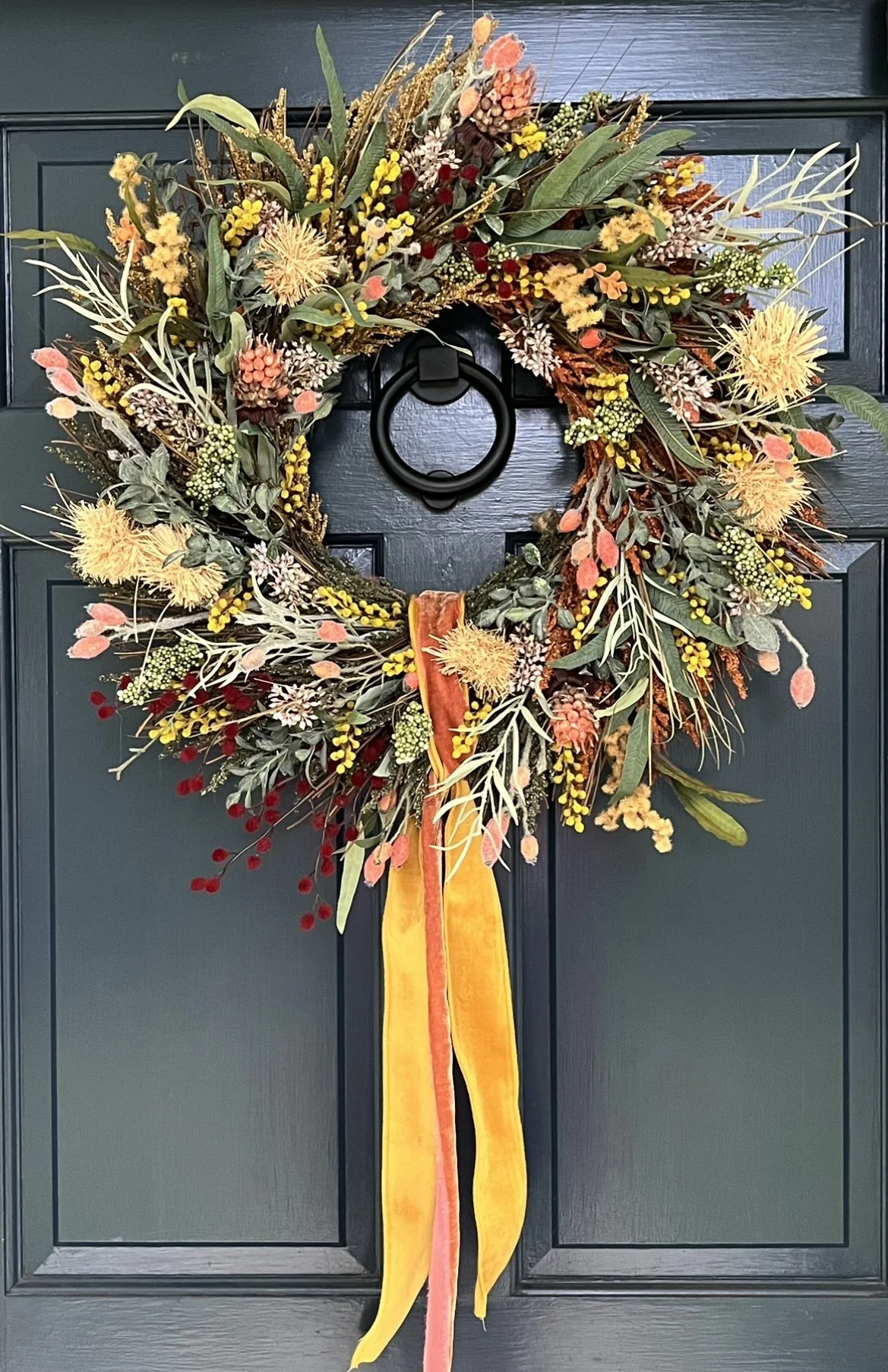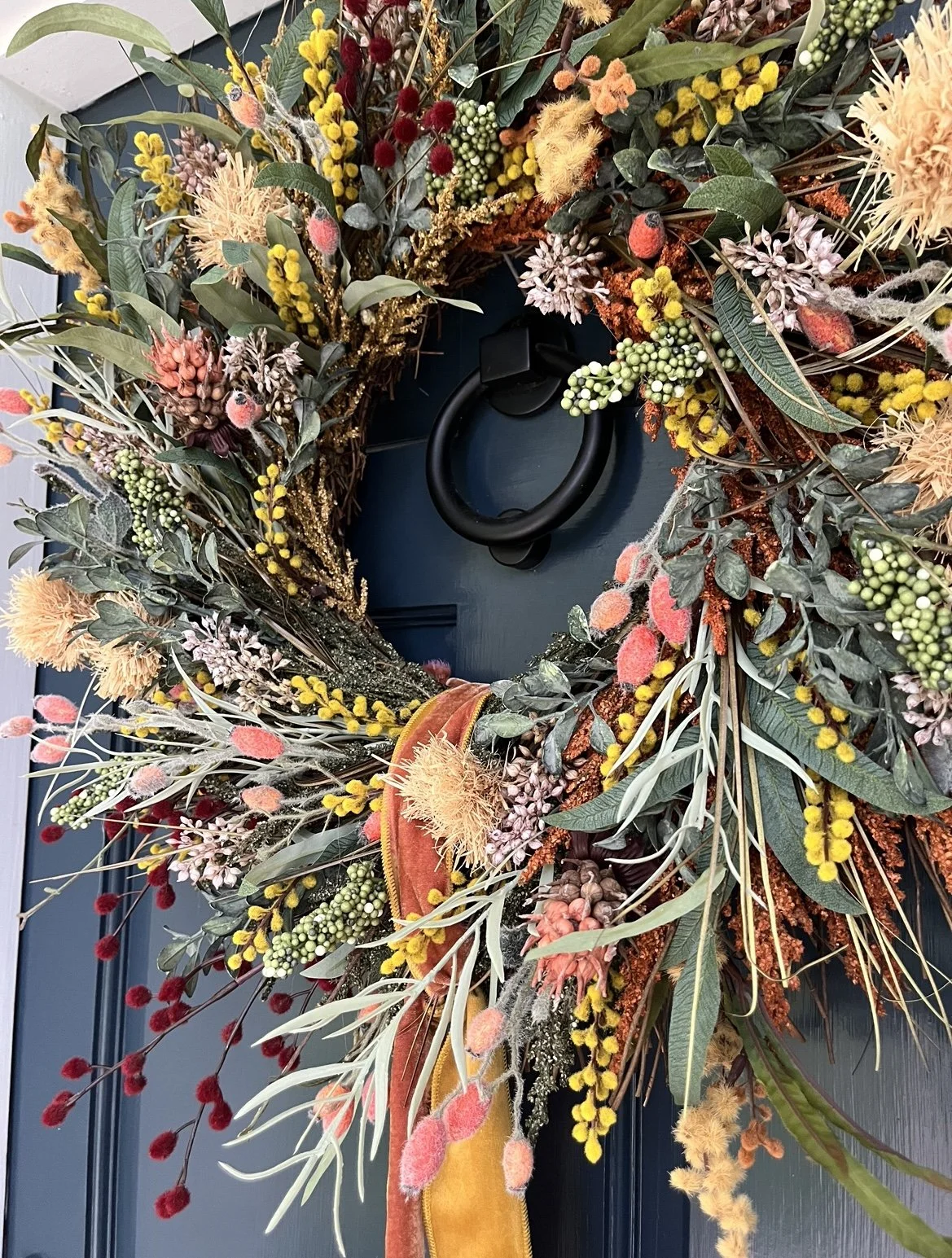 It's time to warm up your doors as we head into cooler weather! With pops of peach, mustard, burgundy, greens, creams, pink and taupe- these beauties are sure to make a statement against any door! A loosely tied mustard and blush, velvet ribbon is THE finishing touch! (But the color can also be customized if you'd like!) Additionally, these wreaths are FAUX so they are a permanent addition to your home that requires zero care! Each wreath is roughly 24 inches wide and designed by hand with intricate detail. No two wreaths are completely identical so yours is promised to be one of a kind.